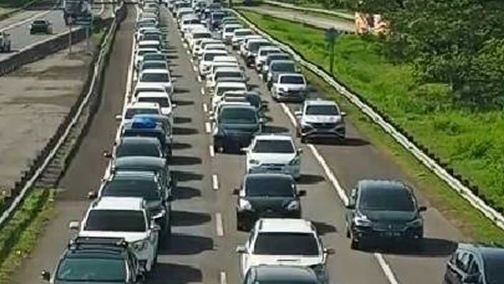 Kendaraan arus balik membentuk antrian panjang mencapai lebih dari 5 kilometer menuju arah GT Cikopo atau GT Cikampek.