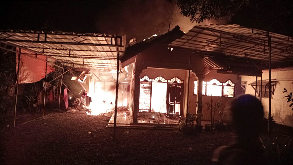 Kemudian api menjalar ke plafon yang terbuat dari anyaman kulit bambu hingga menyebabkan terbakarnya seluruh bangunan.