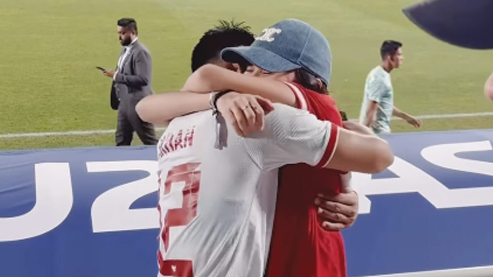 Setelah tendangannya berhasil menjebol gawang Korea Selatan, Pratama Arhan menghampiri sang istri yang duduk di bangku cadangan.