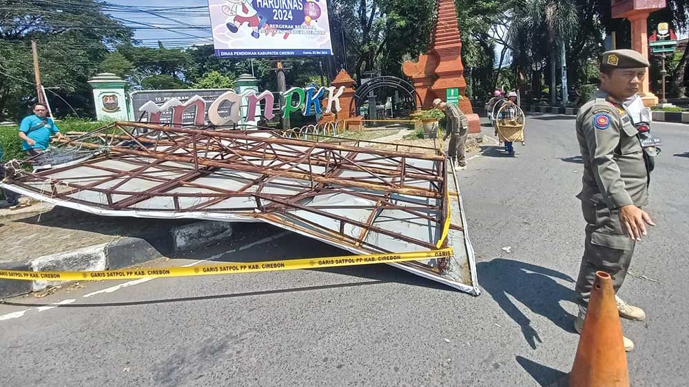 SUARA CIREBON – Papan reklame berukuran besar yang berada di depan Taman PKK roboh, Senin, 6 Mei 2024 siang, sekitar pukul 11.40 WIB.