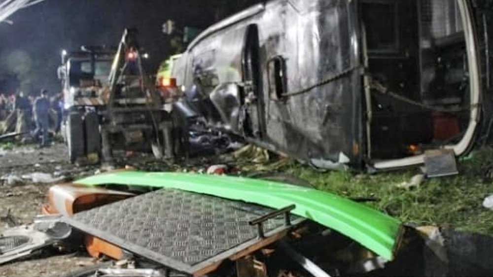 Bus yang diduga mengalami rem blong, dalam perjalanan pulang ke Depok setelah menginap di Bandung untuk acara perpisahan siswa SMK Lingga Kencana Depok.