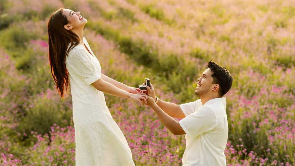 Aaliyah Massaid dilamar dengan romantis di sebuah taman dengan bunga-bunga yang indah. Terlihat dari wajah mereka yang sedang dimabuk cinta.