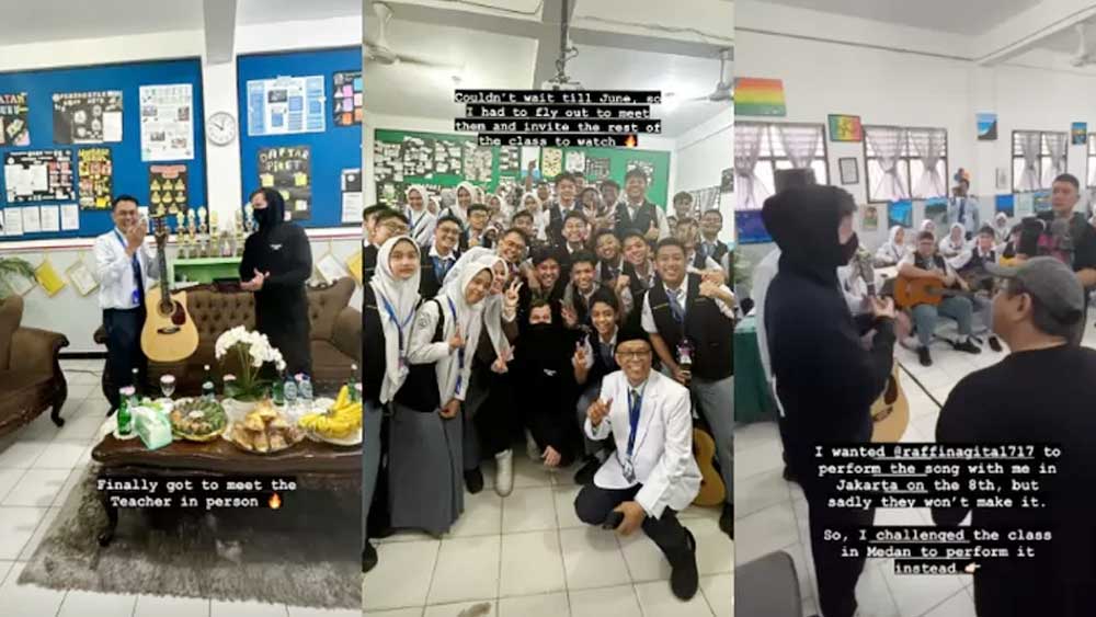 “Dikunjungi sang idola @alanwalkermusic ke sekolah bertemu dengan murid-murid saya dan bernyanyi bersama adalah sebuah mimpi yang terwujud nyata,” tulis Caption Tri Adinata dalam foto tersebut mengungkapkan kegembiraan bertemu Alan Walker.