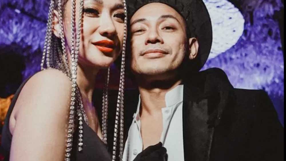Sedangkan suaminya Tiko Aryawadhana tampil menggunakan tuxedo berwarna hitam lengkap dengan topi fedora.
