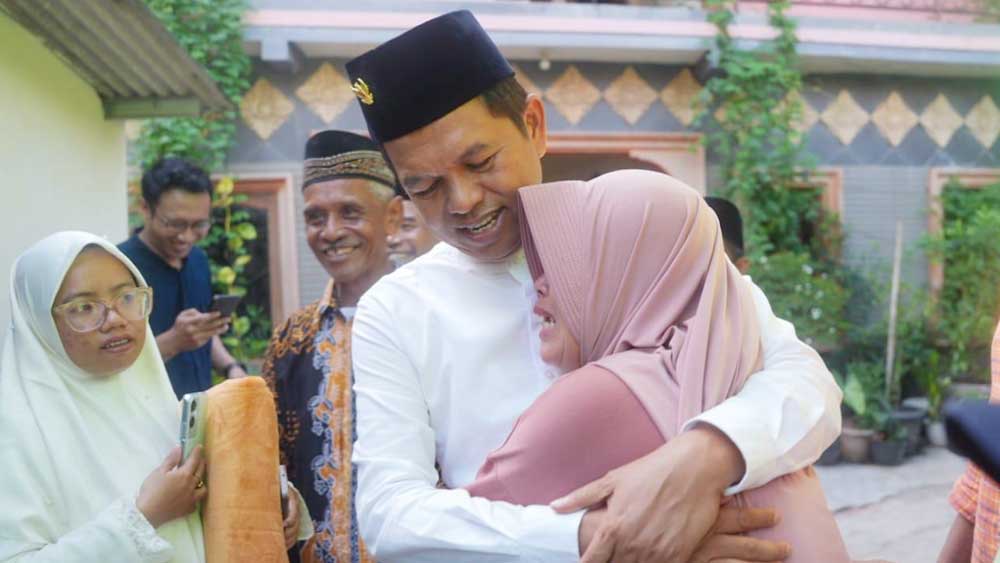Emak-emak menangis dan berebut bisa memeluk KDM. Terlihat ada seorang ibu, berkerudung merah, yang tiba-tiba mengejar dan memeluk KDM sambil menangis usai melaksanakan salat.