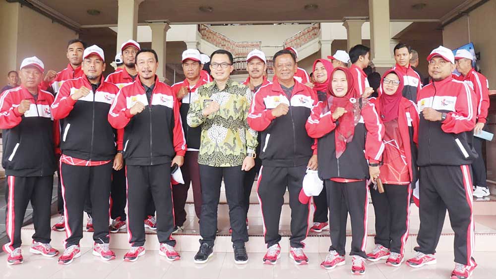 SUARA CIREBON – Pj Bupati Cirebon, H Wahyu Mijaya melepas puluhan atlet dan ofisial yang akan berlaga dalam pekan olahraga dan seni antardaerah perbatasan (Porsenitas) XI 2024, di ruang Paseban Setda, Kabupaten Cirebon, Jumat, 5 Juli 2024.