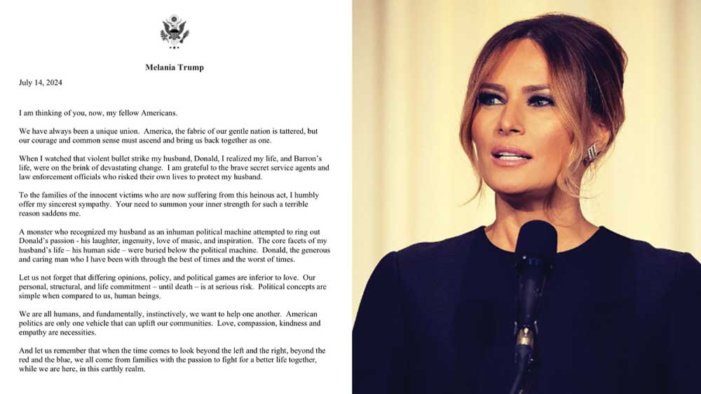 “Saya berterima kasih kepada para Agen Dinas Rahasia (Secret Service) dan para petugas penegak hukum yang berani mempertaruhkan nyawa mereka untuk melindungi suami saya,” lanjut Melania Trump mengucapkan terima kasih kepada intelijen Amerika yang bergerak cepat melumpuhkan pelaku penembakan terhadap suaminya.