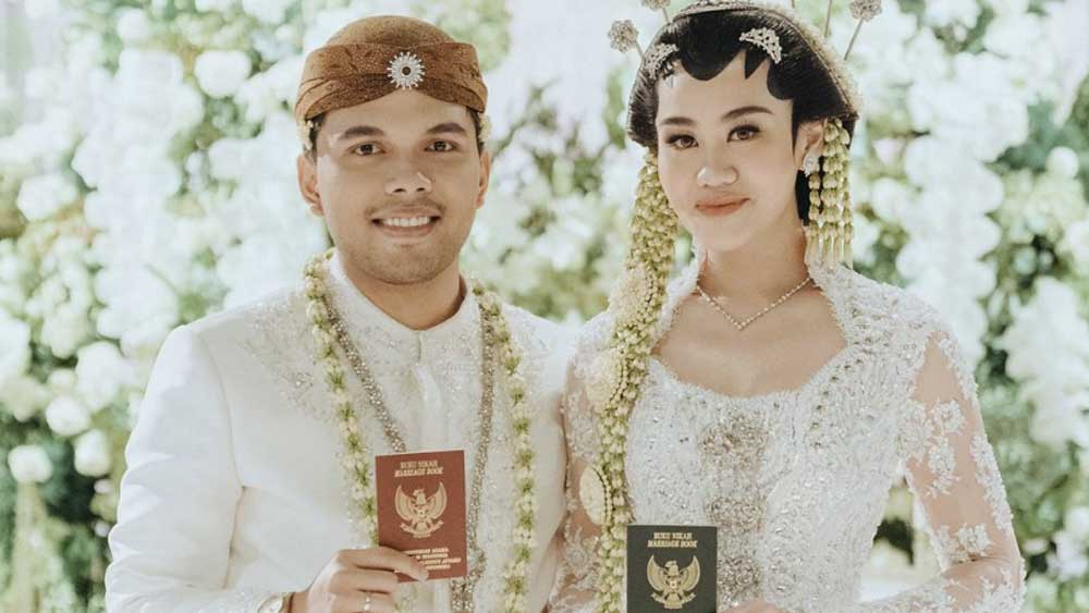 Aaliyah Massaid mengenakan kebaya pernikahan berwarna putih dan Thariq Halilintar mengenakan pakaian berwarna senada. Keduanya nampak serasi.