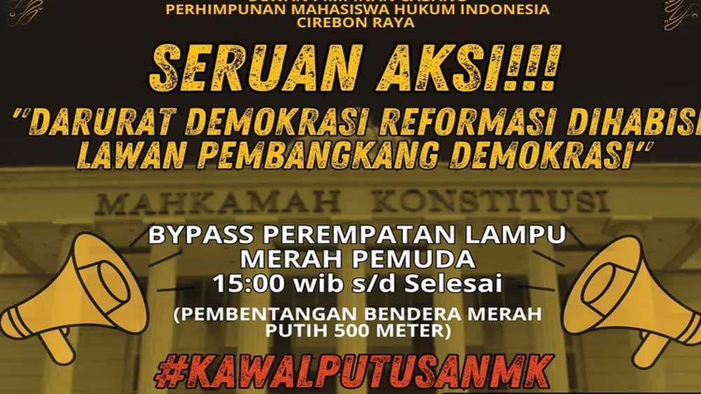 Seruan demonstrasi dismapaikan DPC Perhimpunan Mahasiswa Hukum Indonesia Cirebon Raya. Aksi akan digelar Kamis siang ini, 22 Agustus 2024.