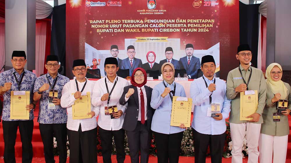 SUARA CIREBON – KPU Kabupaten Cirebon menggelar rapat pleno terbuka pengundian dan penetapan nomor urut pasangan calon bupati dan wakil bupati pada Pilkada atau Pilbup Cirebon 2024.