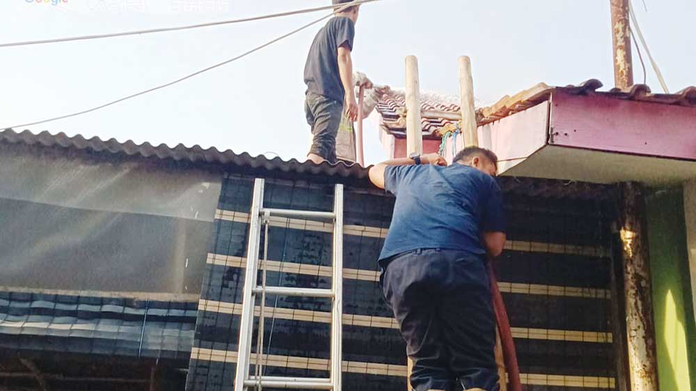 “Saat pemadaman dari atas atap yang terbuat dari asbes salah satu warga jatuh yang menyebabkan anggota Damkar juga ikut jatuh dari ketinggian kurang lebih 2,5 meter, diduga struktur atapnya tidak sesuai,” kata Eno.