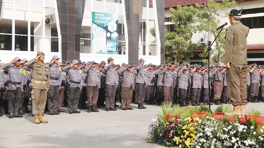 SUARA CIREBON – Pj Wali Kota Cirebon, H Agus Mulyadi memimpin apel gelar pasukan Satuan Perlindungan Masyarakat (Satlinmas) dan petugas pengamanan Pilkada serentak 2024, di halaman Balai Kota Cirebon, Kamis, 17 Oktober 2024.