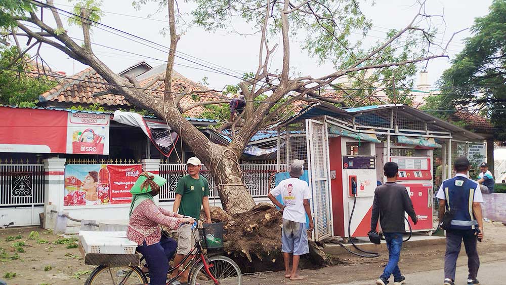 Salah satu faktor tumbangnya pohon albasia tersebut disebabkan akar pohon yang lapuk ditambah tanggul di saluran yang tidak kuat menahan beban.
