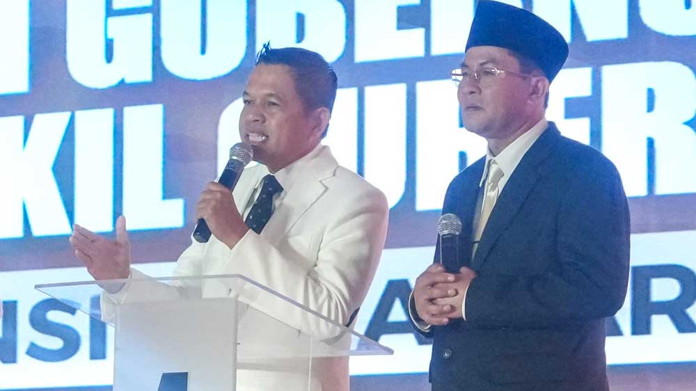 Kombinasi pakaian putih dan hitam sengaja dipilih KDM dan Erwan Setiawan saat menyampaikan gagasannya di atas forum debat.