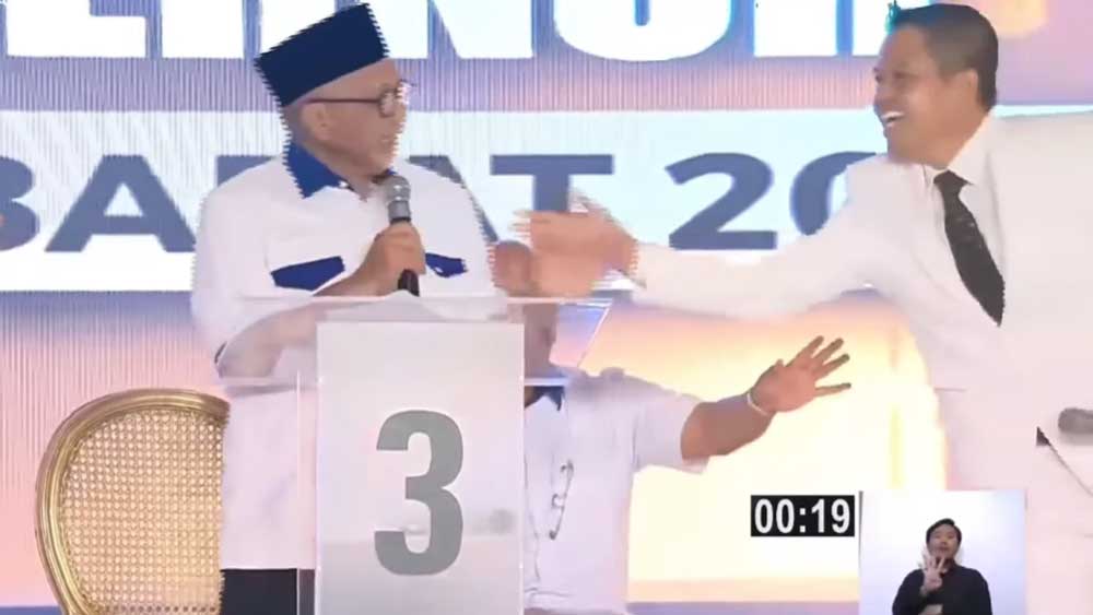 Momen lucu tadi ketika giliran paslon nomor 3 melempar pertanyaan ke nomor 4. Diwakili Cagub Ahmad Syaikhu yang melempar pertanyaan ke KDM sebagai cagub paslon nomor 4.