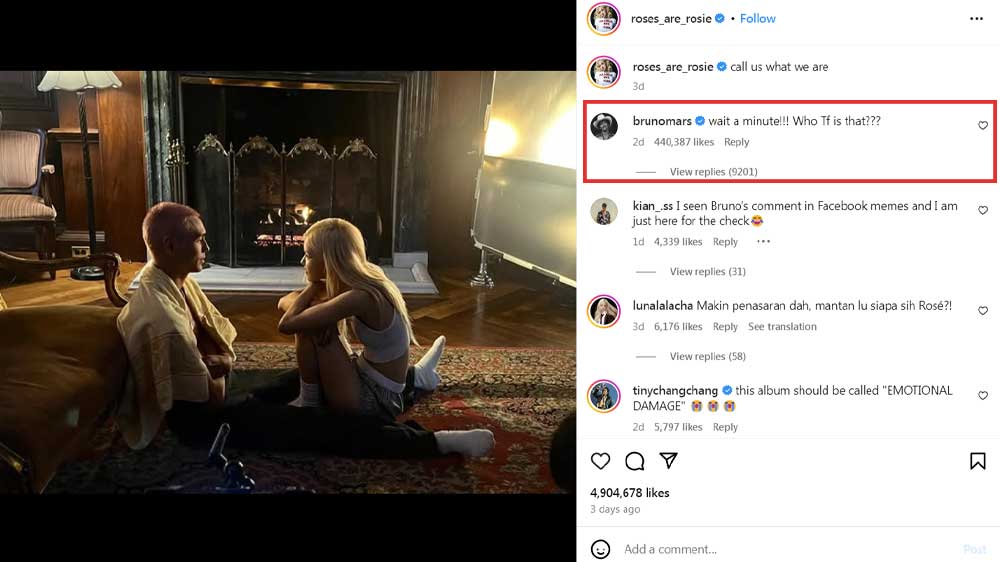 Sontak postingan itu pun mendapat 16 ribu komentar. Salah satunya dari Bruno Mars, penyanyi kondang Amerika yang baru saja berkolaborasi dengan Rose.