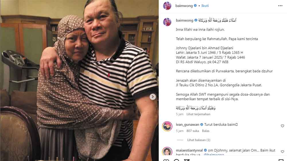 “Inna lillahi wa inna ilaihi rojiun. Telah berpulang ke Rahmatullah, Papa kami tercinta Johnny Djaelani bin Ahmad Djaelani.” tulis Baim Wong yang tengah menjalani proses perceraian dengan Paula Verhoeven.