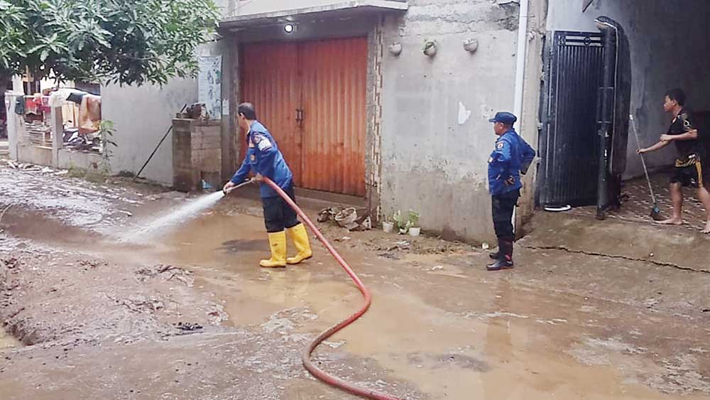 Para petugas Damkar dari sejumlah pos jaga tersebut, berjibaku menyemprotkan air pada area-area yang masih terdapat sisa lumpur, termasuk drainase yang bermasalah.