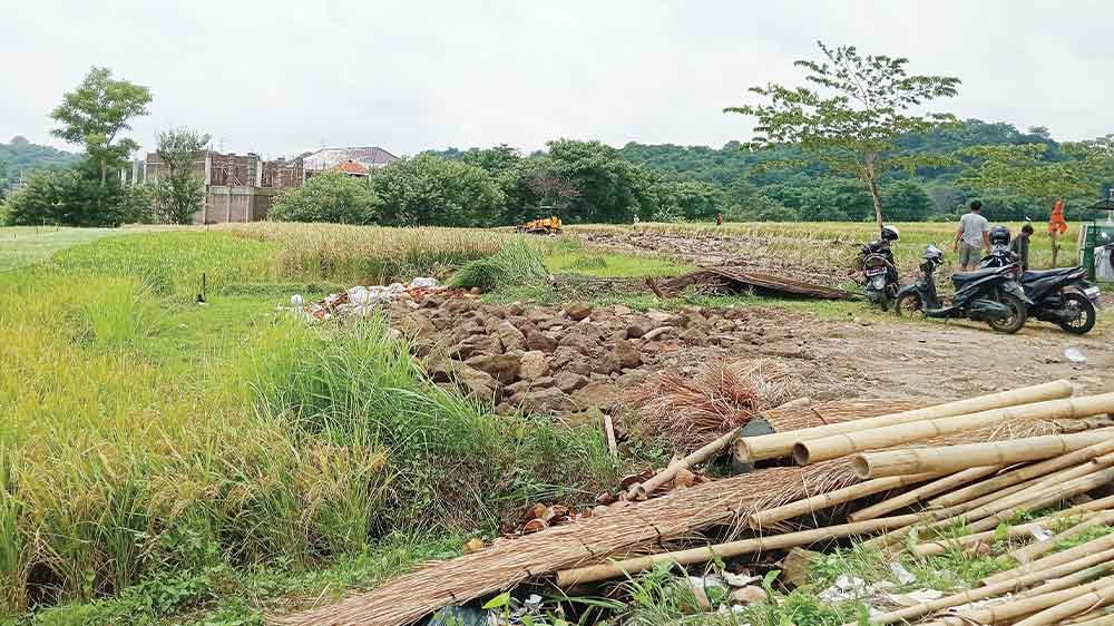 Di beberapa bagian lainnya, sudah mulai dipasangi pagar dan tanda-tanda pembangunan. Sementara di sekitarnya masih terlihat hamparan sawah hijau yang dikelola oleh petani.