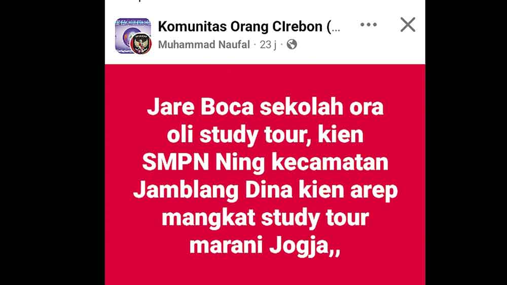 Dalam postingannya Muhammad Naufal mengunggah tulisan, “Jare Boca sekolah ora olih study tour, kien SMPN Ning kecamatan Jamblang Dina kien AREP mangkat study tour marani Jogja”. Postingan itu langsung mendapatkan reaksi netizen, berbagai komentar pun diutarakan oleh netizen.