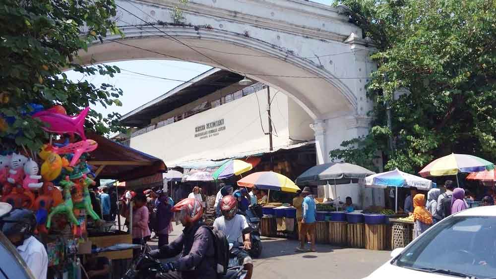 Di Pasar Kanoman para pedagang menggelar lapak dagangan sampai keluar area pasar sehingga menyebabkan kemacetan terutama di jalur yang menuju ke Keraton Kanoman.