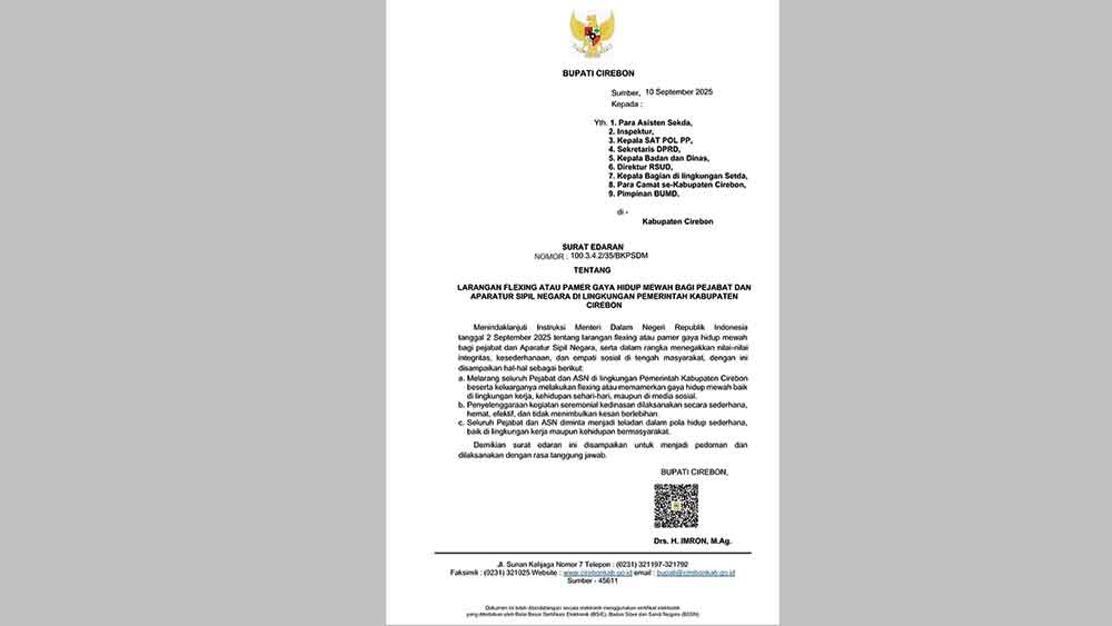 Kebijakan tersebut tertuang dalam Surat Edaran Nomor: 100.3.4.2/35/BKPSDM tentang Larangan Flexing atau Pamer Gaya Hidup Mewah bagi Pejabat dan ASN di lingkungan Pemkab Cirebon tertanggal 10 September 2025.