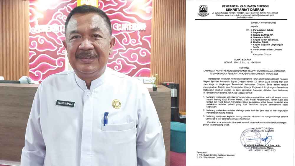 Hal itu tertuang dalam surat edaran (SE) tentang Larangan Aktivitas Non-Kedinasan di Tempat Umum Selama Jam Kerja. Surat edaran dengan nomor 800.1.6.2/ BKPSDM tersebut, ditandatangani Sekretaris Daerah (Sekda) Kabupaten Cirebon, Hendra Nirmala, per tanggal 4 November 2025.