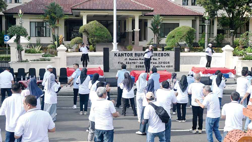 Salah satu kegiatan yang digelar adalah senam bersama yang diikuti ratusan pegawai di lingkungan Pemkab Cirebon dengan penuh semangat.