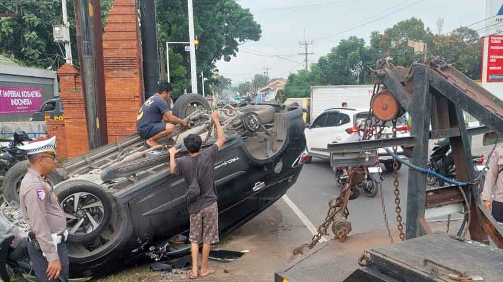 Benturan keras tersebut mengakibatkan mobil berwarna hitam itu terguling dan berhenti dalam posisi terbalik di pinggir jalan. Kendaraan mengalami kerusakan pada beberapa bagian bodi.