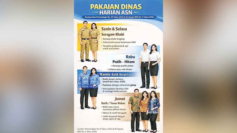 Untuk hari Rabu, seragam yang diinstruksikan untuk dipakai adalah seragam putih-hitam. Sementara, hari Kamis seragam batik Korpri dan hari Jumat berseragam batik atau tenun bebas.