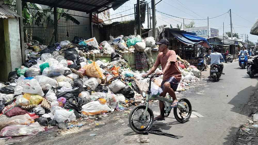 SUARA CIREBON – Tumpukan sampah di Tempat Pembuangan Sampah (TPS) Pasar Minggu Palimanan, Kabupaten Cirebon meluber hingga ke badan jalan.
