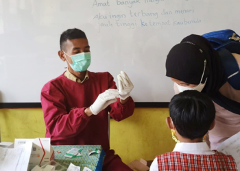 KABUPATEN CIREBON, SC- Para tenaga medis Puskesmas Mayung, Kecamatan Gunungjati, Kabupaten Cirebon melaksanakan vaksinasi murid sekolah usia 6 - 11 ...